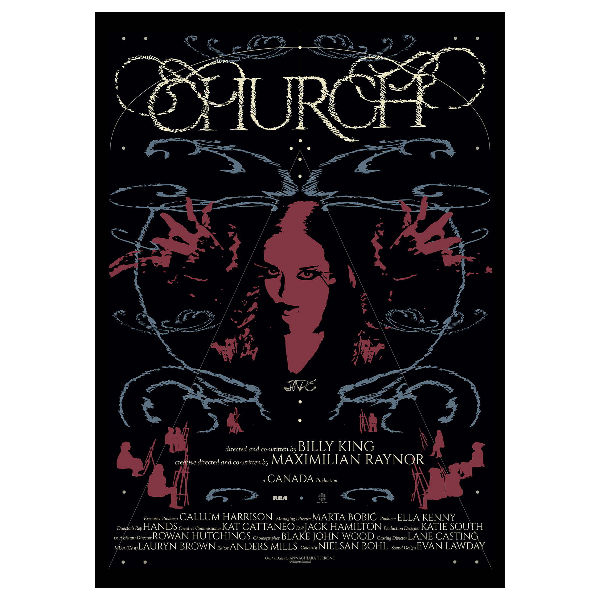 A cinematic, gothic-inspired JADE print featuring the “Church” artwork, ornate typography, symmetrical flourishes, and a striking central portrait.